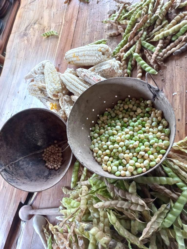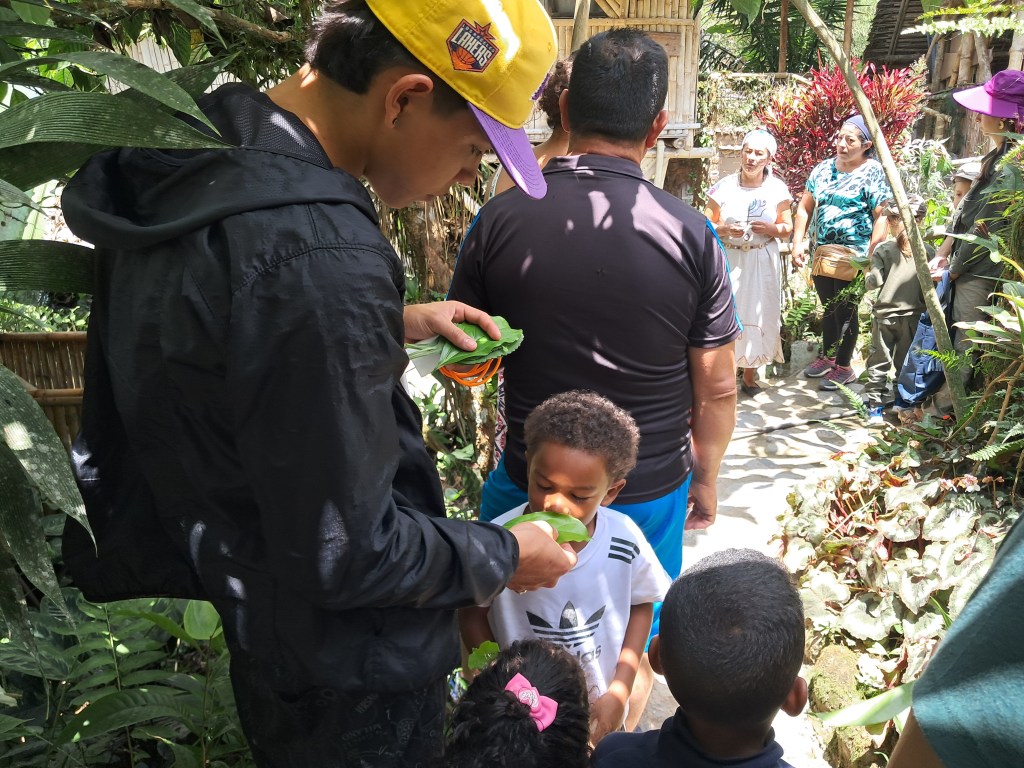 - Vitelia Alarcón, reconocida habitante de la comunidad, compartió su vasta experiencia en el uso de plantas silvestres para la alimentación y la medicina. Allí mostró a los participantes —niños, jóvenes y adultos— productos poco convencionales como la papa aérea (Dioscorea bulbifera), que acompañó con fréjol guandul (Cajanus cajan), plátano verde cocido y una salsa de maní. Todos estos ingredientes fueron cultivados y cosechados por la misma Vitelia.