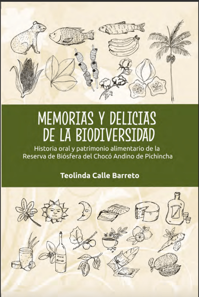 Esta obra, publicada en 2023, bajo el auspicio del Instituto Nacional de Patrimonio Cultural, pone en valor los saberes alimentarios de las comunidades rurales de la Reserva de Biósfera del Chocó Andino de Pichincha a partir de la historia oral y el diálogo intergeneracional. El libro documenta prácticas culinarias, productos locales y relatos de vida que evidencian la relación entre cultura alimentaria, biodiversidad y formas de vida campesinas, y se propone como un aporte a la salvaguardia del patrimonio alimentario y a procesos de educación, investigación y gestión cultural y ambiental desde un enfoque comunitario.